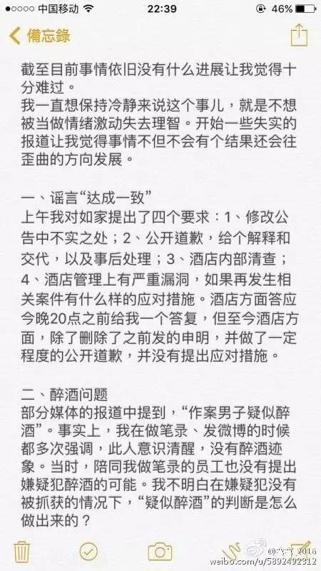 至于弯弯提出的四条要求,如家集团勉强做到了公开致歉和删除此前不实的声明。弯弯昨晚的微博表示“太失望了“。