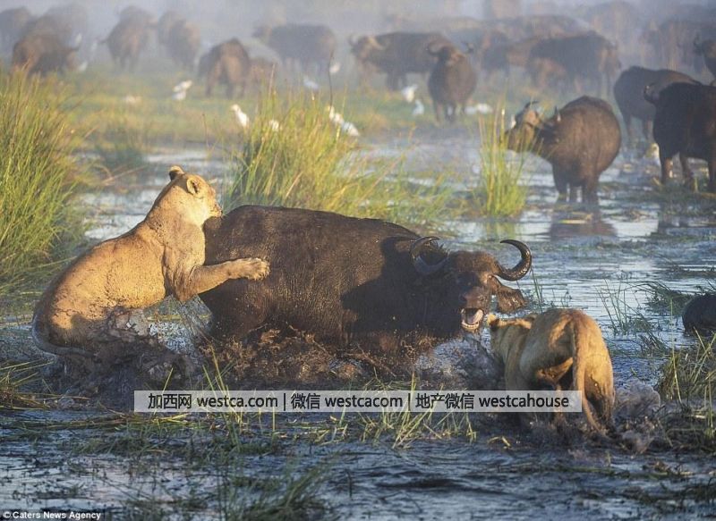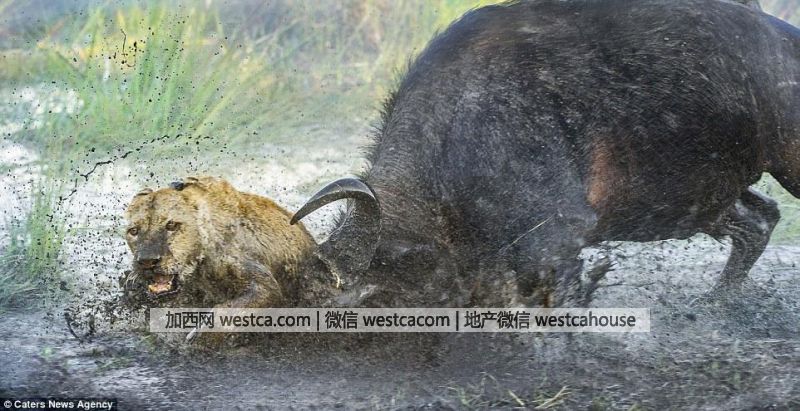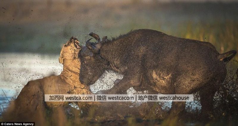 43歲的Wim表示:“公牛突然沖過來驅趕母獅,兩頭獅子都幸運地逃跑了,但是在交鋒中公牛看到其中壹頭獅子已經受傷,就集中攻擊它,頂它並把它推進淤泥裡。我從來沒有見過這樣的場面。”