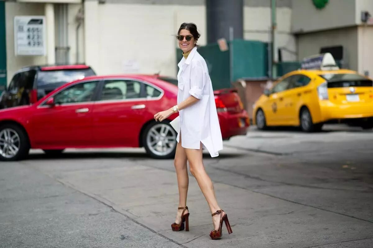 莉安德拉·梅丁 (Leandra Medine) 雖然長得不符合國人審美,但是人家會穿啊!這身直筒襯衫裙搭配魚嘴高跟鞋,美腿盡收眼底。