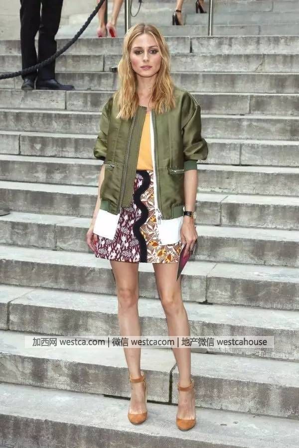 裝備:PhillipLim綠色飛行員夾克,搭配壹條印花短裙,輕松又時髦,喜歡休閒的菇涼可以學起來~