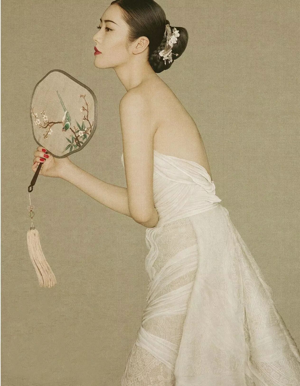 眉眼細挑的劉雯身穿西方高定禮服,卻頭插珠翠,手持團扇,婷婷而立,眉目間自然恬淡,透露出壹絲嬌慵,宛若古時畫中人: