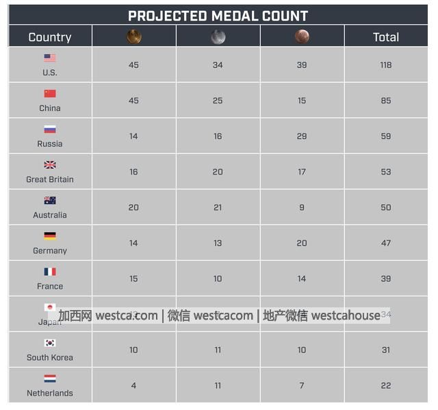 近日,美国权威体育杂志《体育画报》对本届里约奥运会的奖牌榜进行了预测。在为期16天,拥有196个参赛国共计306项夺金项目中,美国队将以45枚金牌,34枚银牌以及39枚铜牌的成绩排名第一。预测中,中国队也能收获45枚金牌,但银牌数与铜牌数不敌美国队而位列奖牌榜第二位。俄罗斯队在田径与举重等项目全遭禁赛的情况下,仍被看好能拿到14枚金牌,16枚银牌和29枚铜牌,将位列奖牌榜第三位。