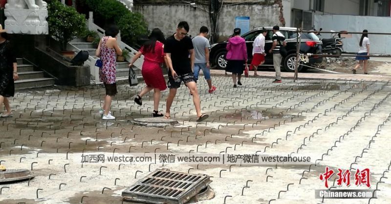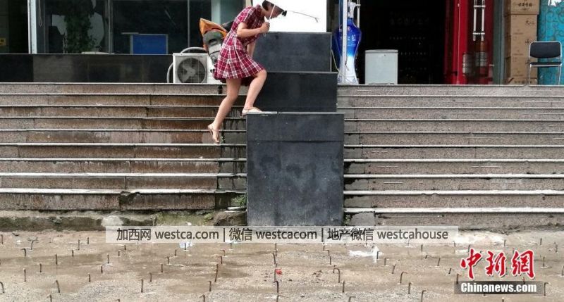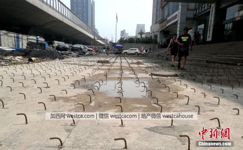 8月10日,河南郑州,位于农业路、花园路附近的豫博大厦写字楼前广场,布满密密麻麻的钢勾。连日来,豫博大厦前广场路面上突然“长”出了密密麻麻、眼花缭乱的弯曲钢勾。图为大厦广场上密密麻麻的钢勾给行人进出造成极大不便。刘鹏 摄