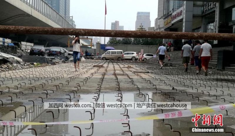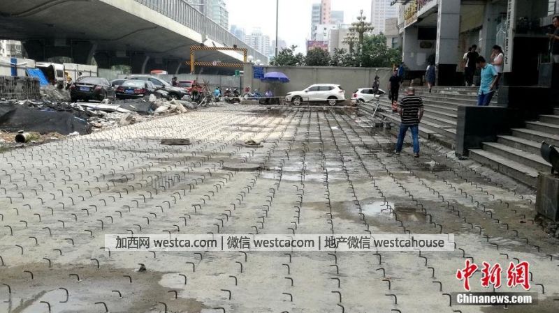 记者经调查了解,当地为了农业路快速通道项目,将该广场规划成了一条行车通道。因此处广场下方系大厦的两层地下停车库,钢勾则是为了下一步的道路加固所用。图为一名在此大厦办公的员工跳上台阶躲避钢勾。