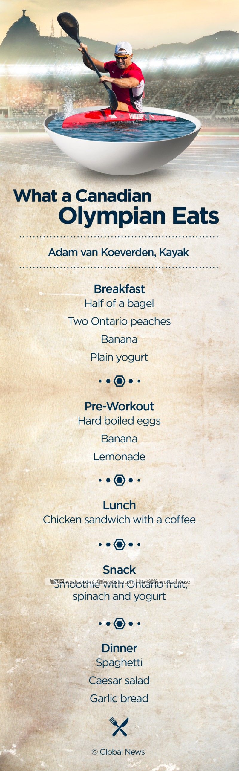 加拿大男子單人皮艇運動員Adam Van Koeverden壹日的餐飲計劃是: