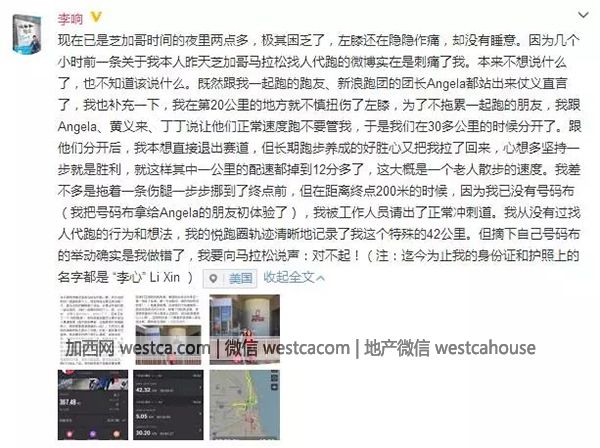 近日,微博號“八哥專用”發出這樣壹條微博:“李響馬拉松代跑!李響發微博稱他在芝加哥跑馬拉松,並發現場圖片。結果有當地的華人網友發現他並未跑步,用他號碼牌跑步的是個外國人。而李響也是等到別人跑步結束後,他拿到別人的號碼牌和獎牌,拍了壹張照片發到微博上,為什麼要這樣虛榮啊?”