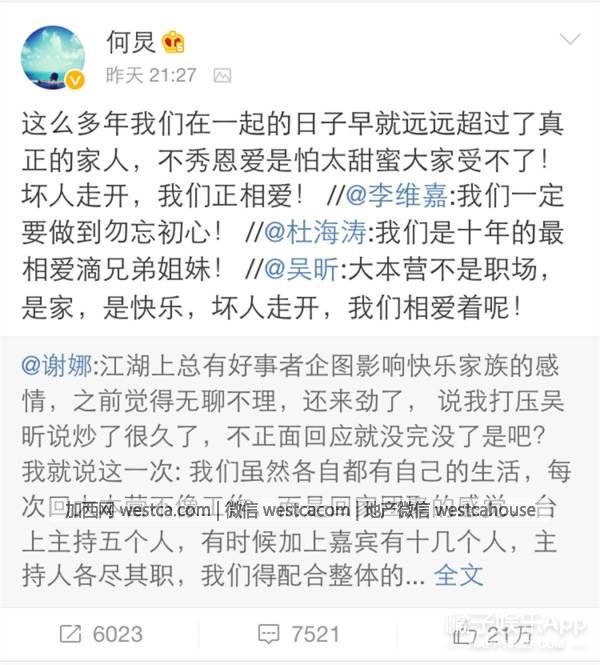 因為有這個流言蜚語存在了很多年,昨天下午謝娜終於忍不了發了澄清微博,快樂家族的人也紛紛轉發表示我們關系好著呢。