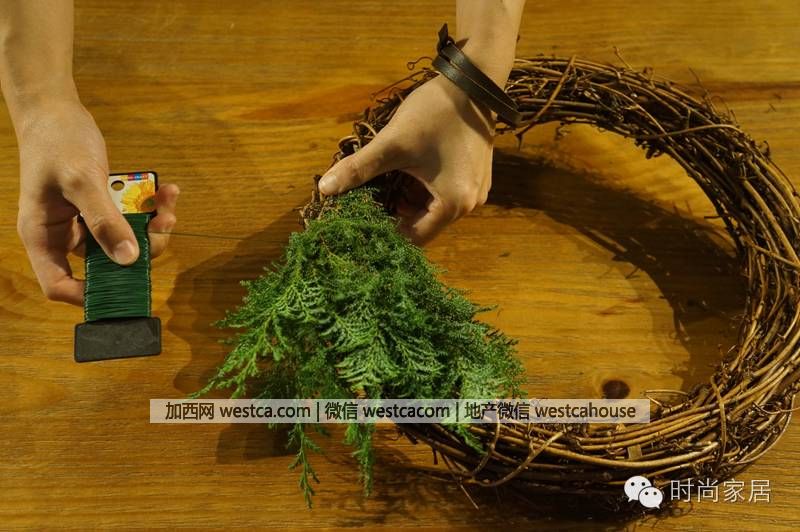 ▲第壹步:將綠色細鐵絲綁定在藤圈上。