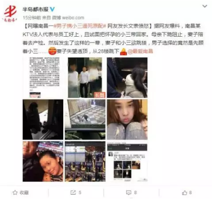 近日,因小三或引发的婚姻问题特别多,这是前几天,一记者跳楼自杀的新闻,这是一个老公让妻子带小三去产检,还把小三带回家,其妻子跳楼自杀的新闻。