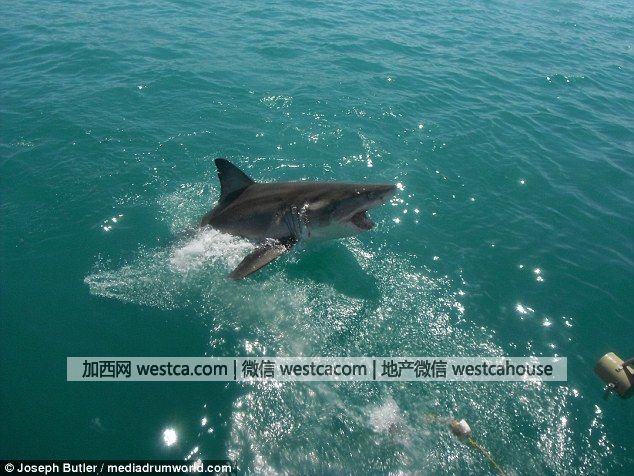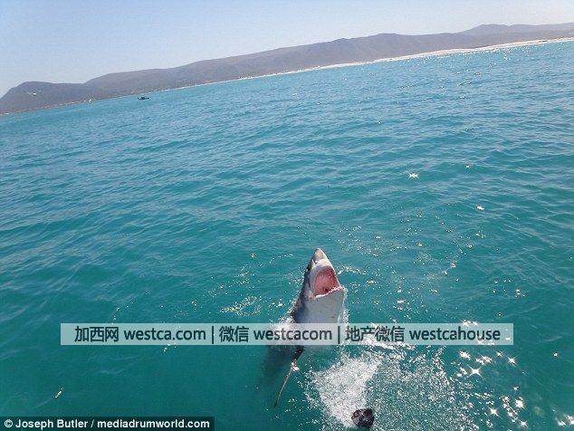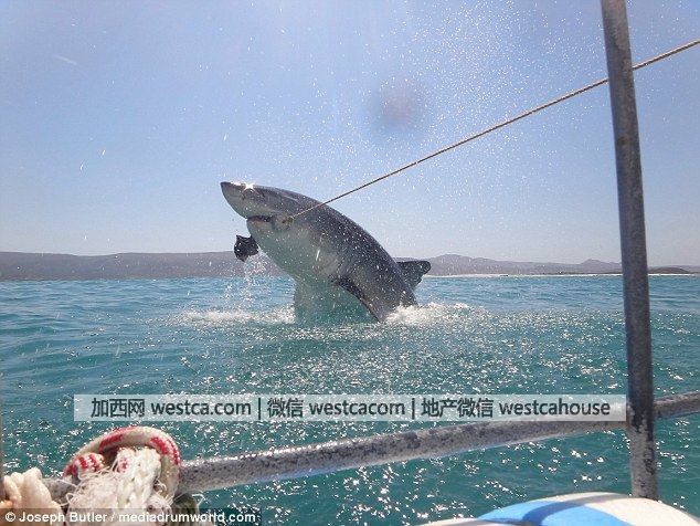 據英國《每日郵報》1月5日報道,近日壹名英國游客在南非近距離拍攝到大白鯊躍出水面捕食獵物的瞬間。從圖像判斷,這條大白鯊長13英尺(近4米),重達1700磅(超過1500斤),當時它正在追逐拴在船上的獵物並張開血盆大口。