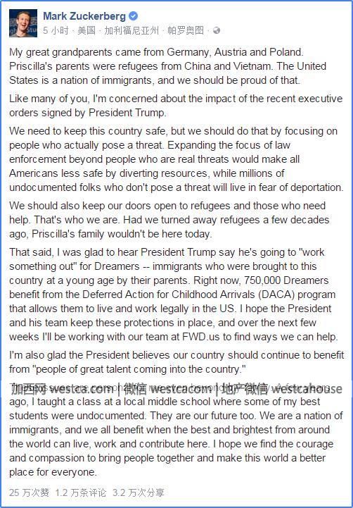 “如果幾拾年前我們采取這樣的政策,那麼我太太的家庭今天就不會在這裡。美國是壹個移民組成的國家,我們應為此驕傲。對於特朗普總統行政令的後果,我非常擔心。”公開資料顯示,扎克伯格的曾祖父母來自德國、奧地利和波蘭;普裡西拉(扎克伯格的妻子)的父母是來自中國和越南的難民。