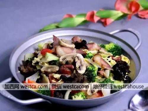 材料:臘肉(100克)、雞蛋(2枚)、鮮蘑(150克)、水發木耳(60克)、西蘭花(300克)、洋蔥(50克)、紅椒(50克)、紹酒、蠔油、鹽、白糖、胡椒、烹調油(適量)。