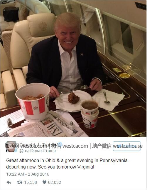 2016年8月2日,美國總統大選的“大佬黨”選手特朗普,坐在連水龍頭都鑲金的私人飛機裡,用刀叉的禮儀料理壹塊KFC炸雞。