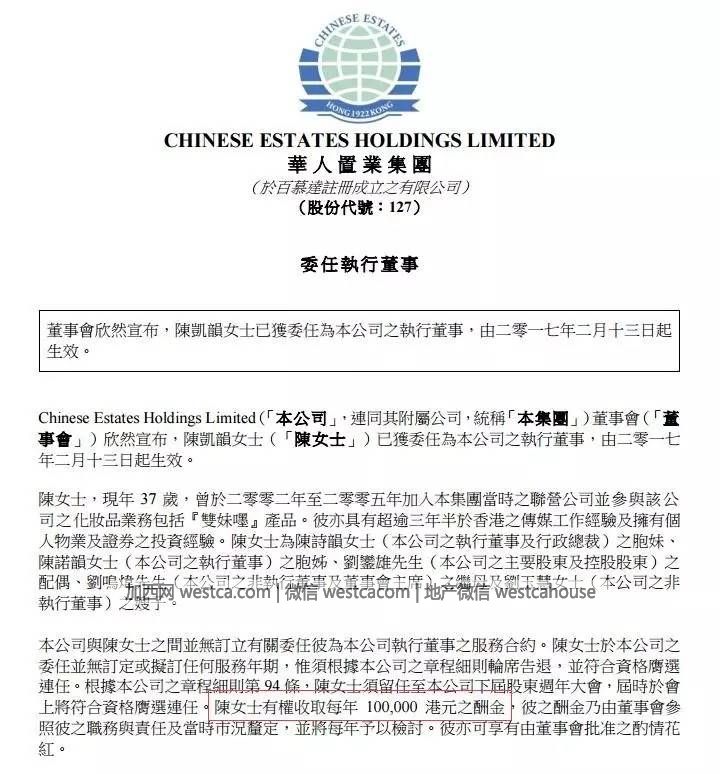 2月13日,華人置業發布公告,甘比(陳凱韻)獲委任為執行董事,即日生效。