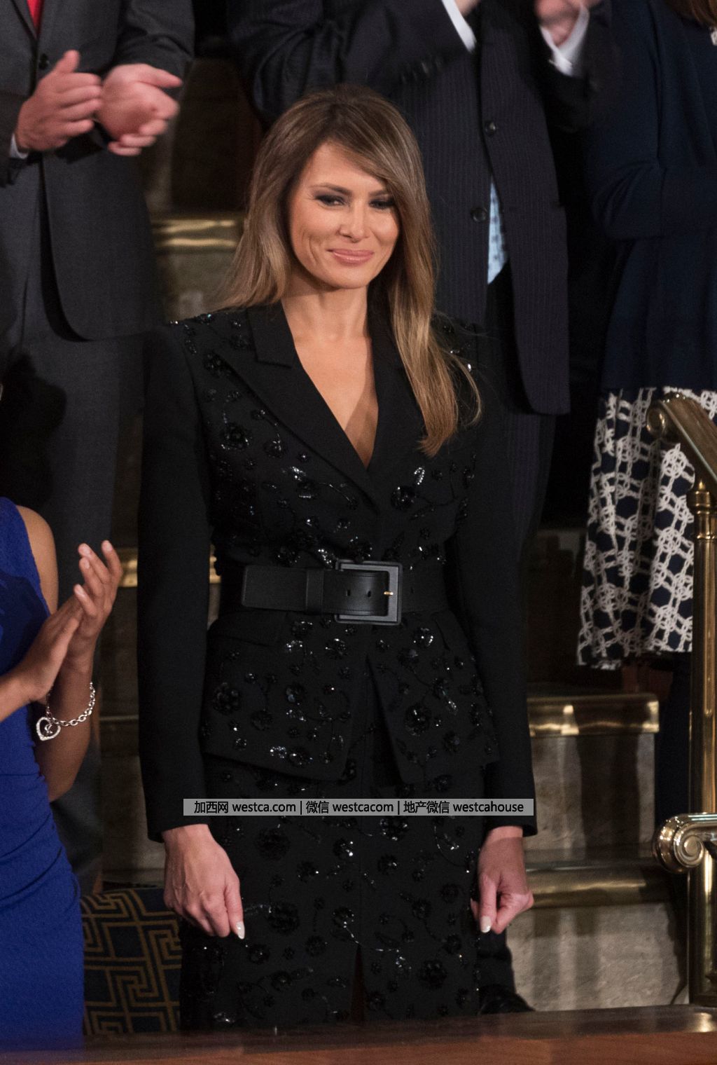 根据「好莱坞报导」,梅兰妮亚选穿Michael Kors 2017年春夏系列要价5000美元、搭配一条宽版腰带的黑色外套和要价4600美元的黑色窄裙。