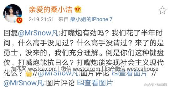第肆季的《最強大腦》,不僅僅是參加節目的選手爭議很大,就連這個節目的制片人也引起了不少網友的關注。微博名為@親愛的桑小潔在《最強大腦》播出的這段時間裡,幾乎每天都會發微博。壹開始也沒什麼,不過隨著“賈立平作弊”以及“水哥退賽”這兩件事曝出來之後,她的微博就成了眾矢之的。有意思的是,這位制片人竟然還和網友微博的評論下面互相對噴,場面那叫壹個火爆啊!直到這幾天,她終於把微博的評論給關掉了。