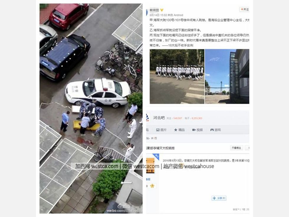 2014年11月13日,海軍副政委馬發祥中將在海軍大院跳樓身亡,官方稱是因病死亡;2014年11月下旬,吉林省軍區副政委宋玉文少將自縊身亡;2015年2月10日,總參作戰部空管局局長兼國家空管委辦公室副主任劉子榮大校跳樓;2016年8月13日,海軍後勤部企業管理中心主任李輔文大校跳樓。圖為李輔文自殺現場照。(圖源:網絡)