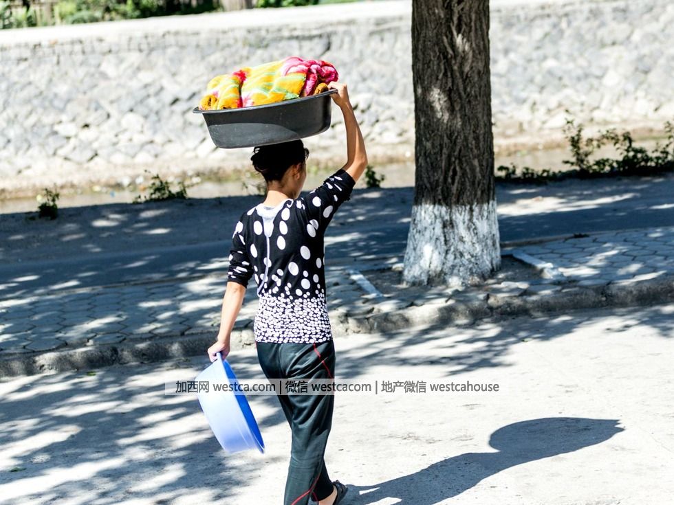 她们在用头顶东西时,一般都不用手扶着,东西稳稳地放在头上,快速行走,也不摇晃。