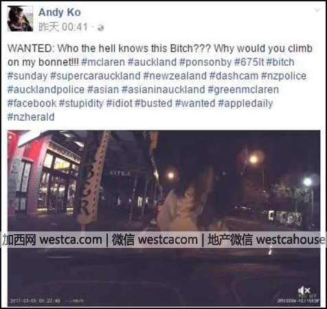 據英國《每日郵報》報道,上周日晚,奧克蘭壹名華裔女子爬上了壹輛豪華跑車,擺pose拍照,這壹幕剛好被附近的豪車主人撞見。