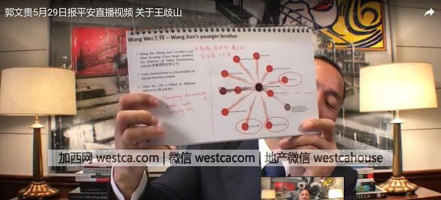 在郭文貴5月29日網絡視頻中,在播放到35分19秒,他舉起壹分報告,有紅色文字寫著“與趙薇,范冰冰,章子怡各同房2-3年”。男主角則是海航集團王健弟弟王偉。被指親江的海外媒體獨家宣稱中共當局派人來美國同郭文貴談判,並在機場大庭廣眾之下險遭美軍抓捕,但此消息沒有美國媒體報道,也沒有目擊者發照片或視頻上網。
