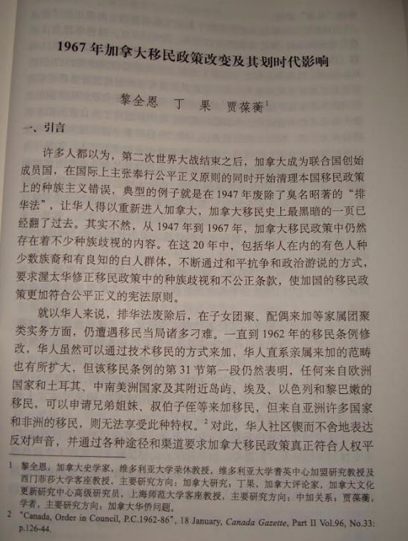 這本學術專著有關加拿大作者方面,收錄了由加拿大著名史學家,加拿大勳章獲得者,被稱為“唐人街之父”的黎全恩教授、加拿大著名評論家丁果和加拿大華裔作家賈葆蘅叁位學者共同撰寫的兩篇論文:1967年移民政策改變及其劃時代影響和多元變化時期的加拿大移民政策。這兩篇論文詳實記載1967年至1989年之間加拿大聯邦政府推出的壹些列移民法案,並圍繞不同時期移民政策加以具體論述。