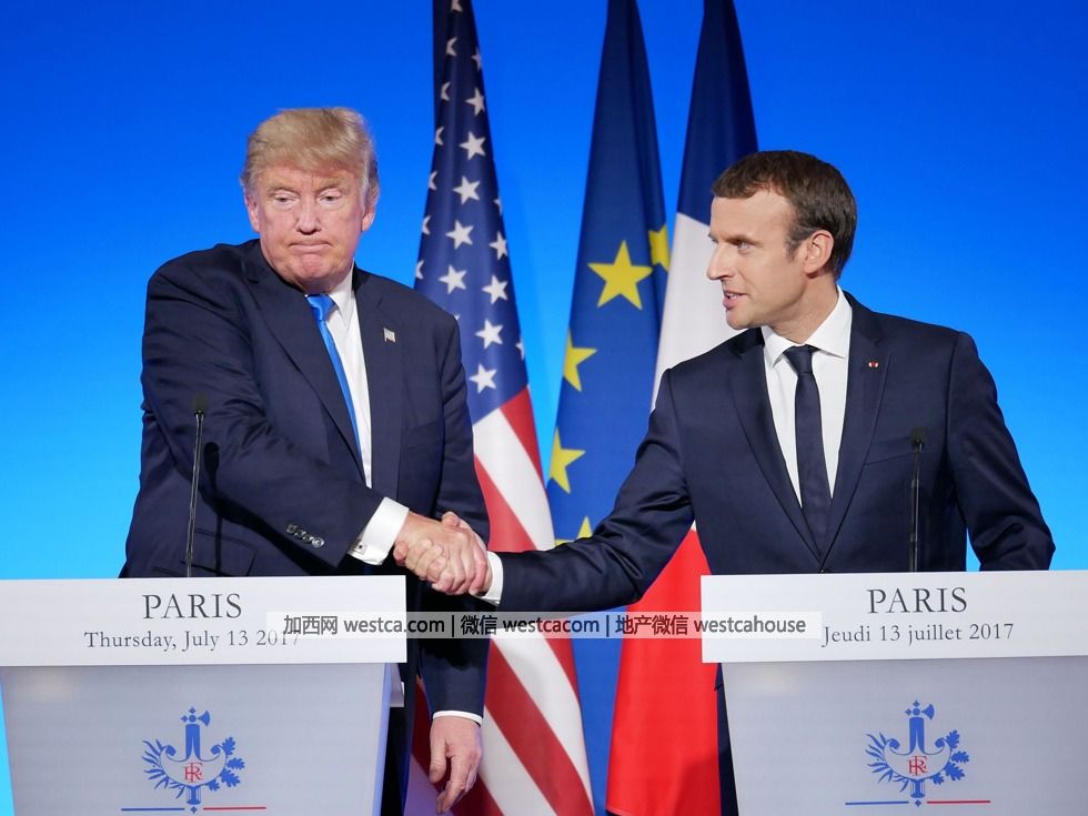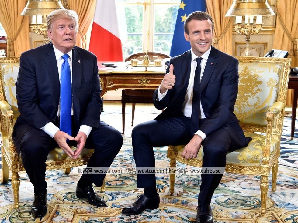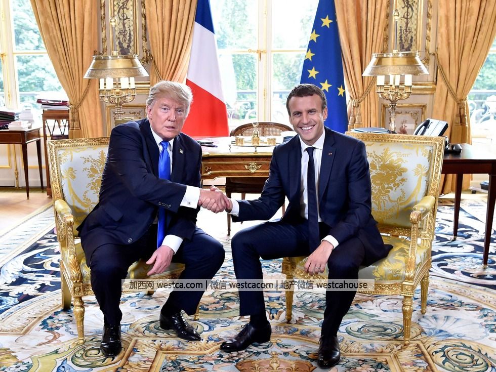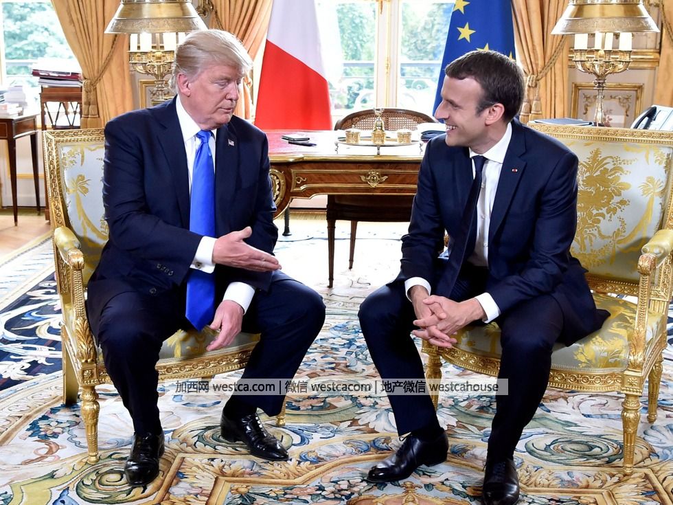 2017年7月13日,美國總統特朗普(Donald Trump)與法國總統馬克龍(Emmanuel Macron)舉行會談。特朗普於7月12日晚啟程飛往法國,法國總統馬克龍對此次特朗普的訪問也頗為重視,已邀請其參加14日的法國國慶日活動。(圖源:VCG)