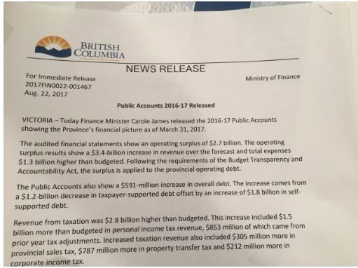 本周早些時候公布的年度報告指出,BC省2016/17公共賬戶盈余為27億元。