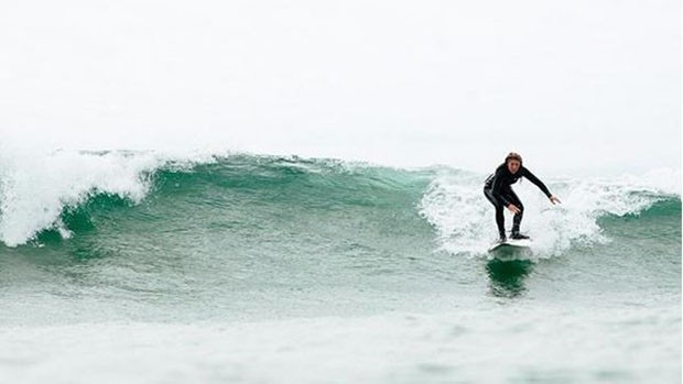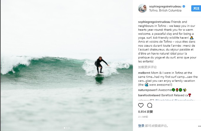 總理特魯多的妻子、叁位孩子的媽媽在網上分享了壹張照片,她於周肆在她的Ins個人帳號曬出,她在BC省著名沖浪小鎮托菲諾(Tofino)玩沖浪的照片。