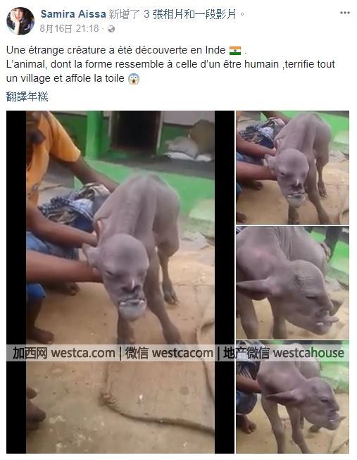 網友艾沙(Samira Aissa)日前於臉書上傳“人面羊”的畸形生物照、1分27秒的短片,並貼文指出,“在印度發現了奇怪物種,既是動物又像人類,嚇壞全村”。影片中隱約可見,身形瘦弱的小家伙,被人包圍且指指點點。