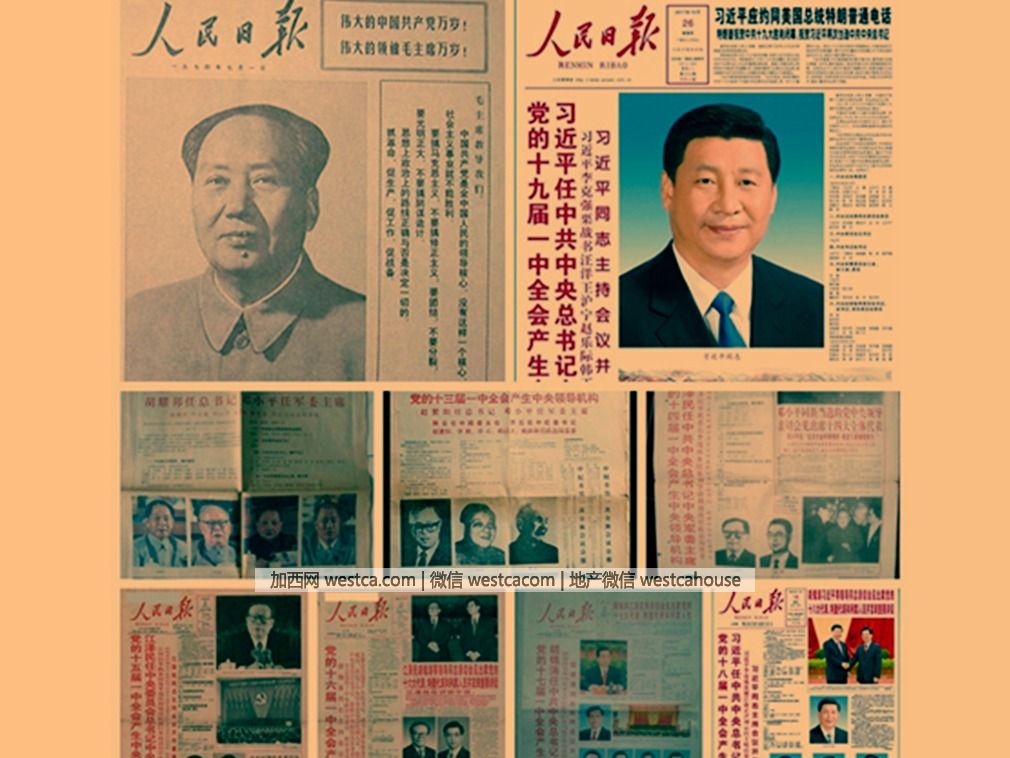這是《人民日報》關於歷次中共領導層產生的報道不同排版的集合。對比壹下,只有習近平和毛澤東使用了巨幅標准照。(圖源:@戰車LI)