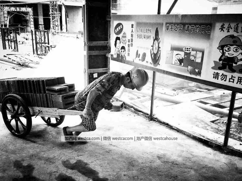 這樣壹車大概壹千多斤,他每天要拉上百車到室外電梯運送到每個樓層,電梯門口有壹個差不多30度的斜坡,每次到那裡他都要用盡全力。(圖源:VCG)