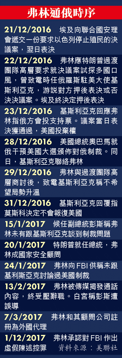 在達成認罪協議後,58歲的弗林前日在華盛頓法院承認在聯邦調查局(FBI)調查他去年12月、即特朗普就任總統前,跟時任俄羅斯駐美國大使基斯利亞克談話壹事上,作虛假陳述。