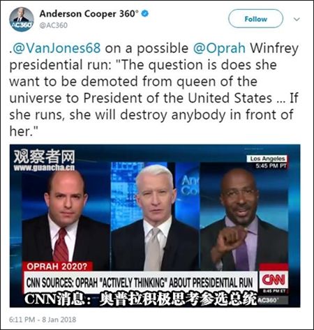 CNN非裔主持人范·瓊斯則評論道:“唯壹的問題是奧普拉是否想從宇宙女王變成美國總統……如果她參選,她將摧毀壹切競爭對手。”