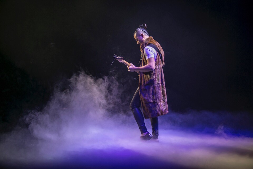 圖注:壹曲古樂剛罷,壹曲動感拾足的現代樂曲又起,給觀眾接連帶來聽覺和視覺的雙重享受。霍譽升老師帶來的吉他彈唱《搖滾西游記》,完美結合中西文化,精湛的彈奏和表演讓全場嗨起來。