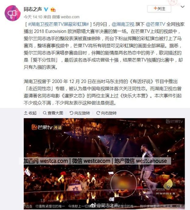 每年壹度的歐洲(電視)歌唱大賽(The Eurovision Song Contest)在周贰(8日)舉行的第壹場半決賽中,"芒果電視"將彩虹旗畫面用馬賽克遮擋,並刪除有同性戀題材和紋身者表演的畫面,在社交媒體上引發批評浪潮。