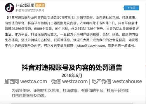 6月11日,抖音公布對違規賬號及內容的處罰通告,2018年5月份累計清理26356條視頻、永久封禁21786個賬號。