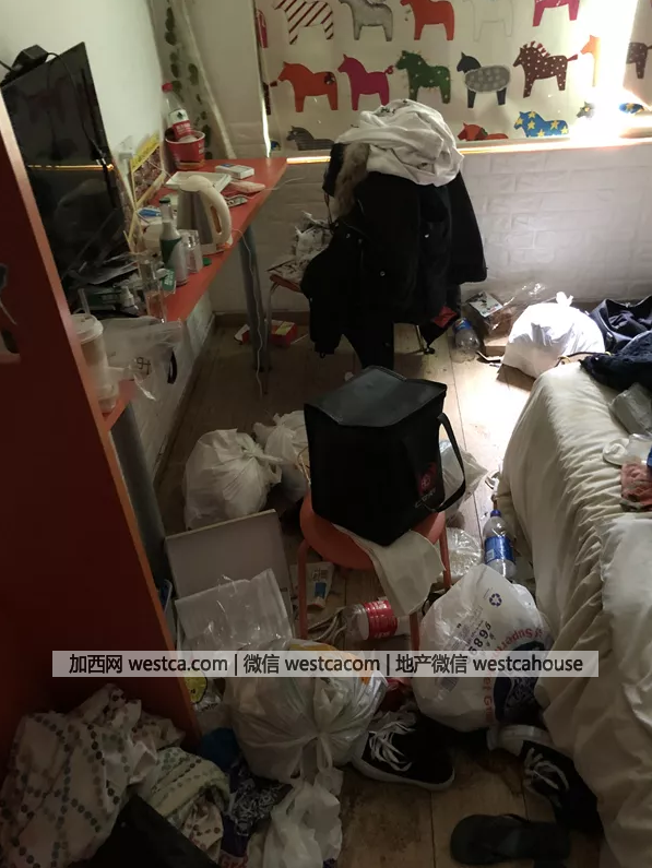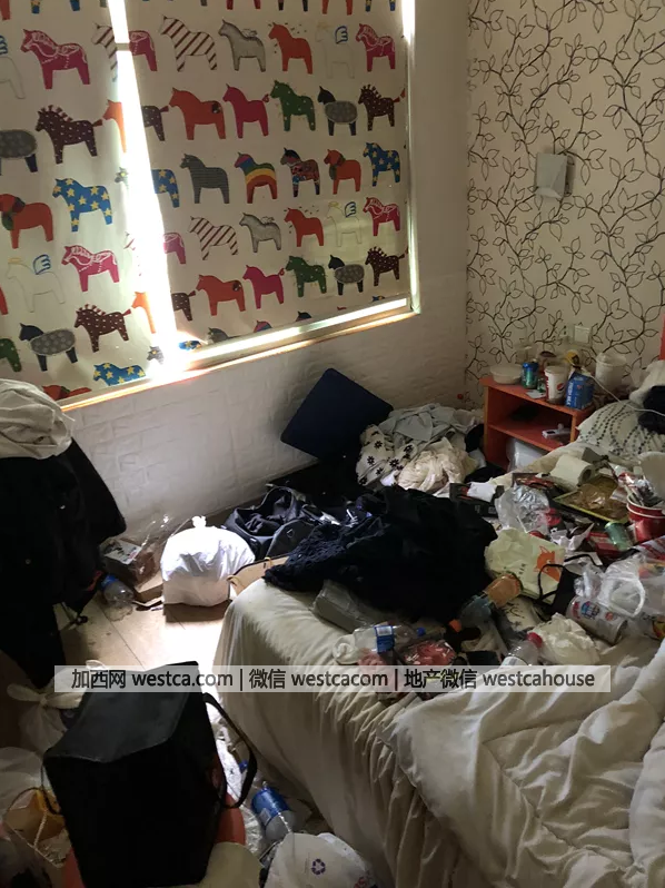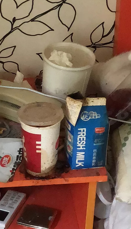 一个十来平米的房间里,堆满了生活垃圾和凌乱的衣物;一张双人床上,半张床上是方便面盒、吃过的外卖、穿过的衣服和各种空饮料瓶;床头柜上,几个空饮料罐叠放在一起,一个开启的牛奶盒已经发黑霉变……