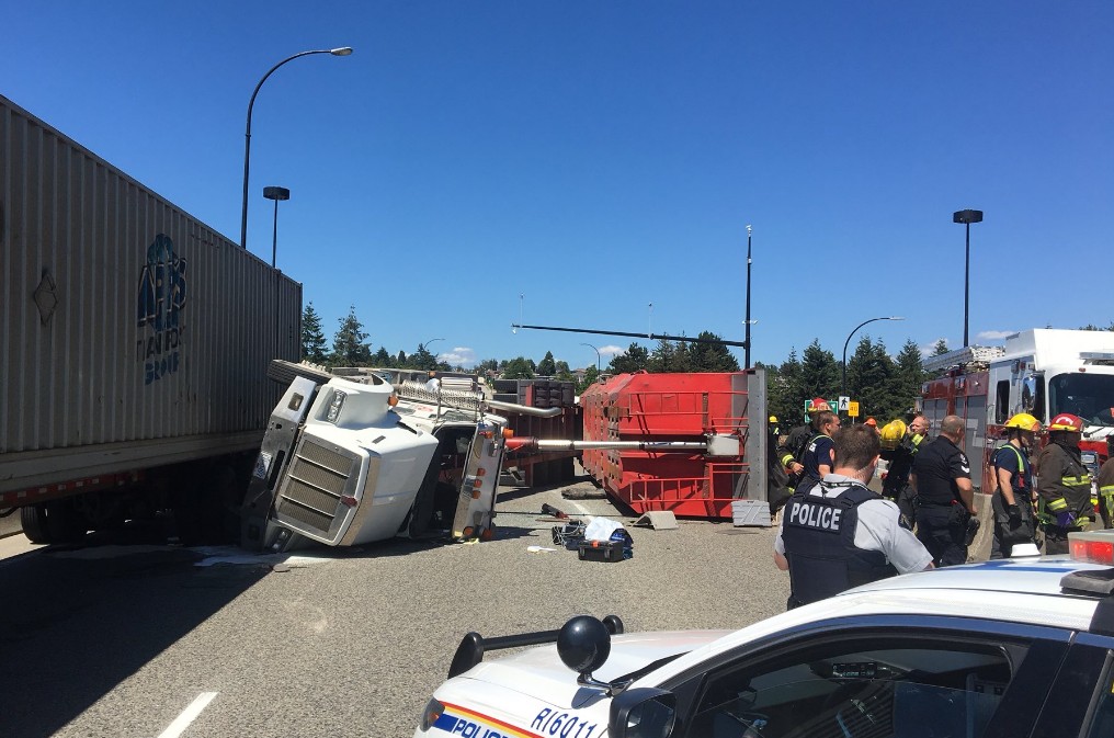 事发2点左右,一辆运载泥头半开放式货柜车沿Knight桥北行,当驶至桥尾位置时,与另一辆货柜车发生轻微碰撞,导致向左翻侧,货柜内的泥头亦泻出。