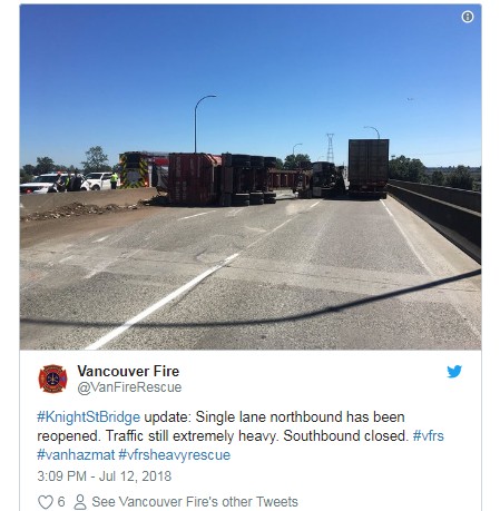 (加西网综合)Knight桥北行方向今日下午发生涉及货柜车意外,由于车架翻侧,横卧路面,桥面来回方向一度全线封闭,现时南行仍然封闭,北行则开放一线行车。