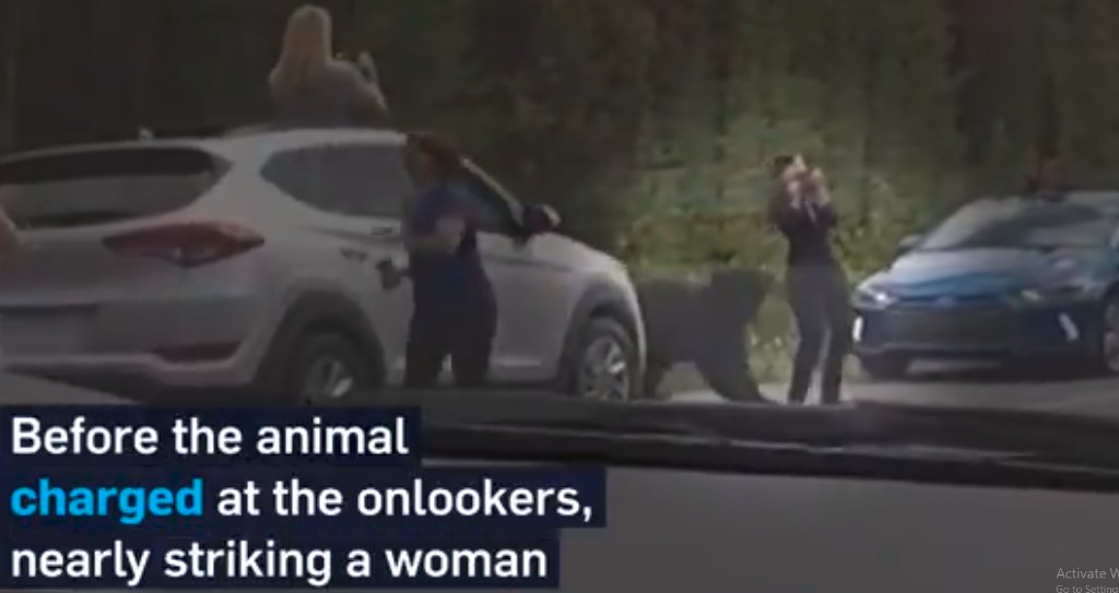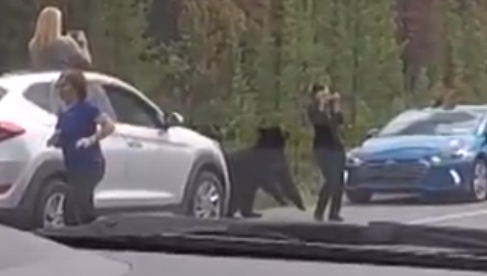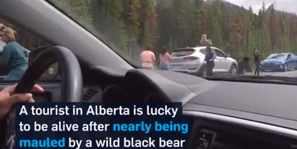 壹名女游客在阿爾伯塔省為了拍攝路邊的黑熊,由於太過於靠近,遭到壹頭黑熊的警告。估計當時這女子的魂都飛了。