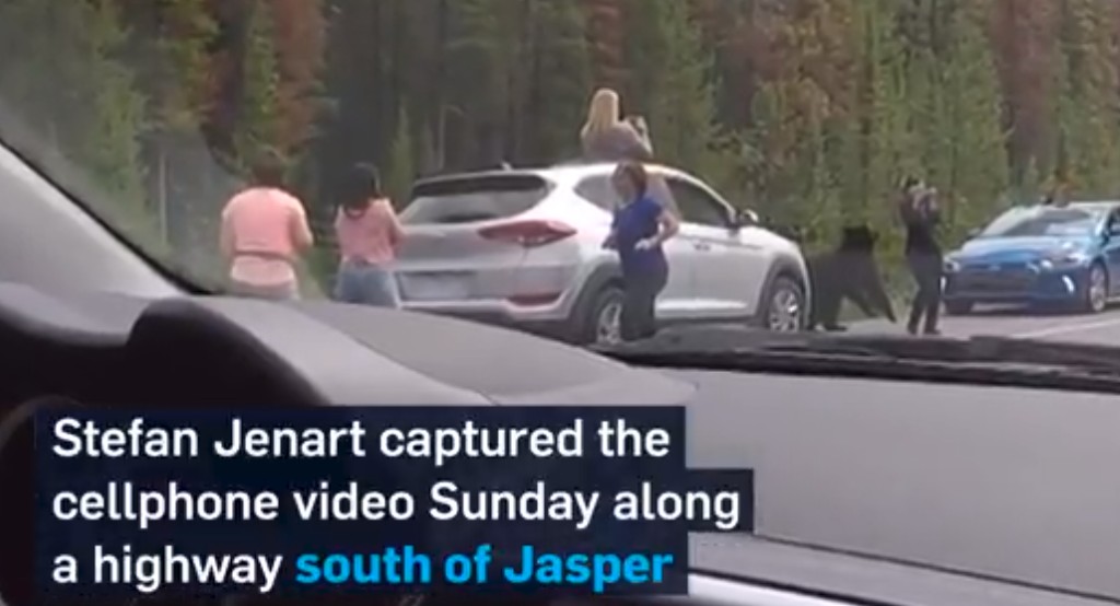 事件發生在上周日7月22號,當時數拾人在賈斯珀國家公園以南的93號高速公路上停車,圍觀路邊的壹頭黑熊,不少人還在狂拍。