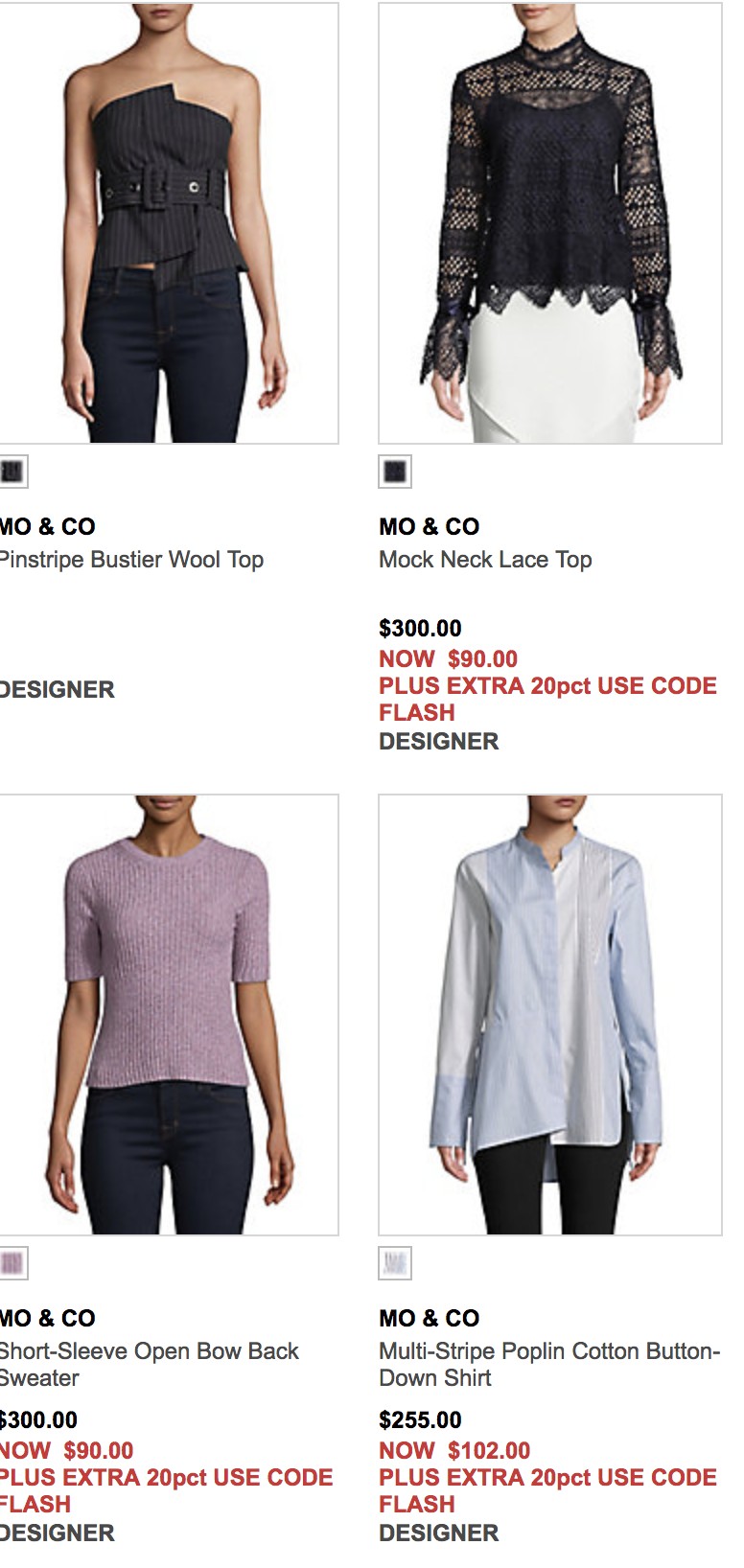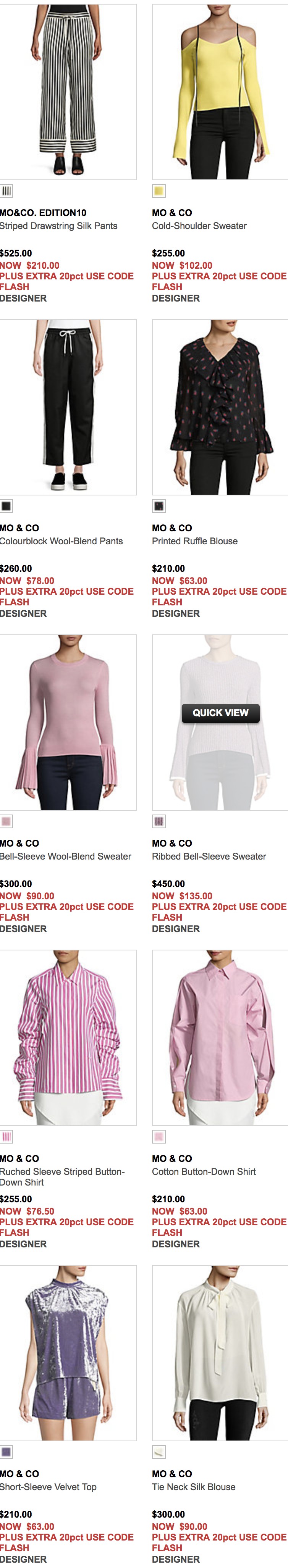 The Bay 現有 國產驕傲的 MO & CO 初秋美衣特賣,明星們都pick哦 低至3折+額外8折,需使用優惠碼"FLASH"。