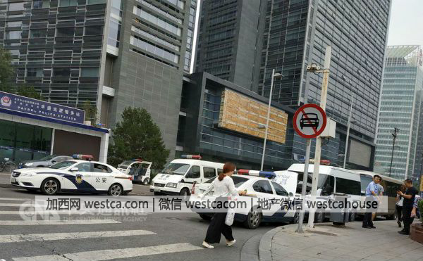 中國大陸P2P公司7月出現集中倒閉,部分受害者8月初串連到北京請願,當地警方將他們強行送走。圖為中國銀監會附近部署大量警車。