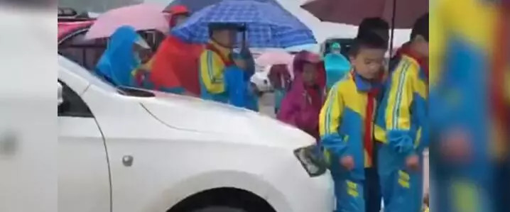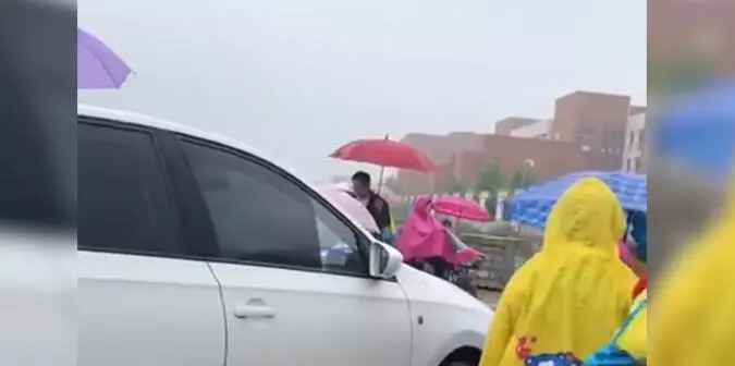 9月18日下午,山東菏澤壹學校門口,天正下著雨,壹輛魯R15V76白色小轎車在此路過,駕駛人不但沒有禮讓過往學生,反而硬是用車頭抵著孩子們的腿,生生蹭出了壹條路。