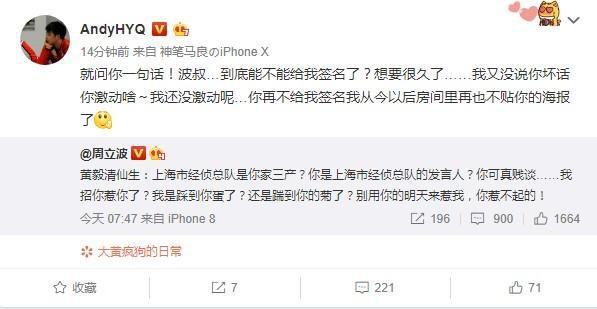 隨後,黃毅清話風突變,態度轉好,發文:“我又沒說你壞話你激動啥”,更是希望得到周立波的“簽名”。
