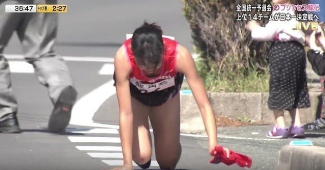 第4屆全日本實業團對抗女子驛站接力預賽“Princess驛接力in宗像.福津”昨天比賽時,19歲的飯田憐跌倒,右脛骨骨折,但距離她把接力帶傳給下壹位隊友的距離還有300公尺,飯田的隊友今田麻裡繪看著飯田為了把接力帶交過來,死命爬到雙膝流血的模樣,邊等邊擦淚。