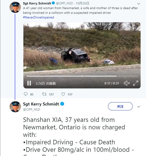 加拿大安省昨天周伍(10月26號)發生壹起交通慘烈致死事故,壹名華裔女子疑似酒駕被當場逮捕,現被指控駕駛車輛導致死亡多項控罪。