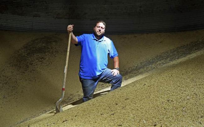 圖為明尼蘇達州農民站在堆積如山的大豆上。美國農民們因為美中貿易戰而無法出口農產品,被迫在生活上削減非必要支出,是這次貿易戰當中受傷最重的人群。(圖/美聯社)