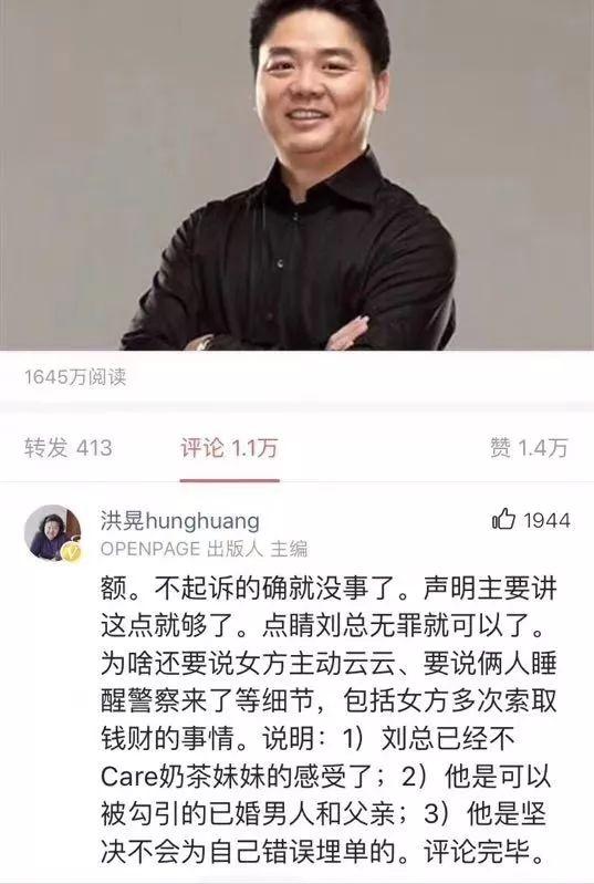 最近,明州警局決定對東哥做不起訴決定,壹時間網上議論紛紛。“名門痞女”洪晃也疑似出來發了個言。