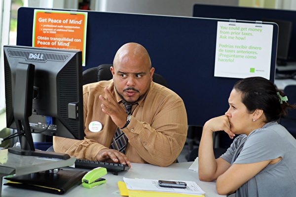 有數據顯示,越來越多的美國人正在“逃離”高稅收的州,從加利福尼亞、夏威夷、新澤西和紐約等高稅收的州搬到其他壹些州稅較低的地方。圖:2010年4月14日,邁阿密海灘,佛羅裡達州,H&R Block稅務助理辦公室經理鮑裡斯•裡奧斯(左)正在報稅截止日期的前壹天幫助瑪格麗塔•甘貝塔(右)填寫報稅表。